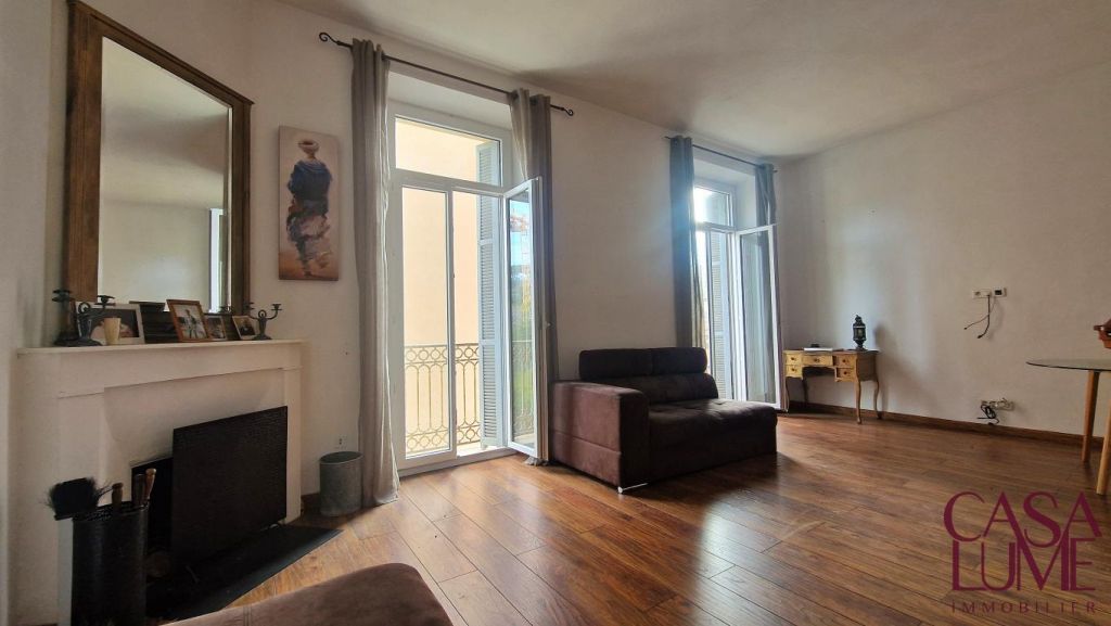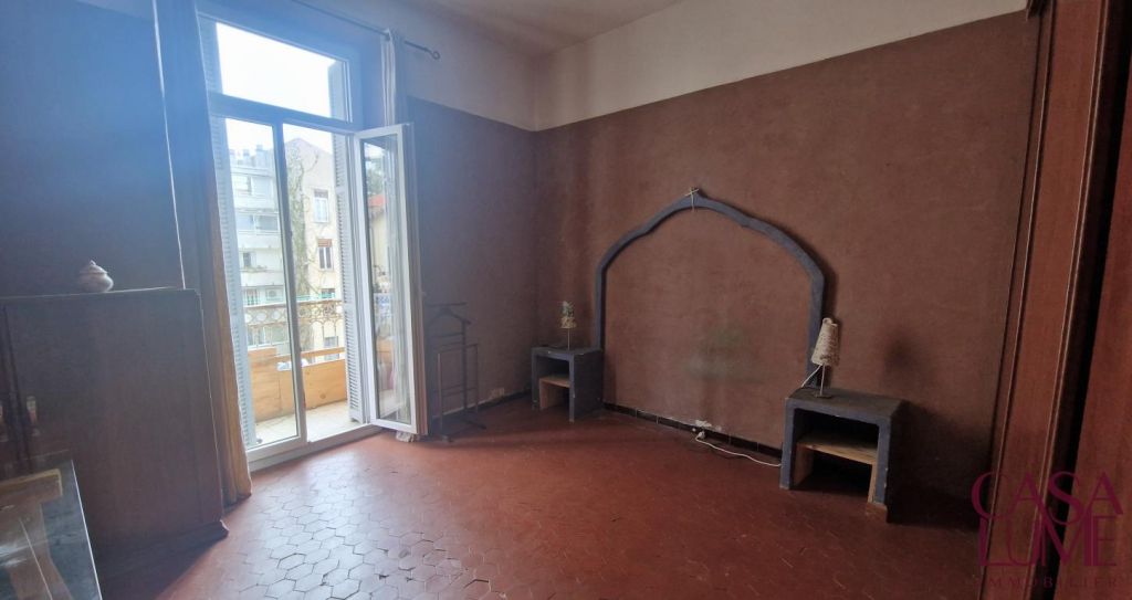 Très grand F2 dans le quartier des étrangers. Le bien est idéalement situé dans une petite rue tranquille à deux pas du cours Grandval, proche à pied du centre ville et de la plage. L’appartement offre une superficie d’environ 62 m² habitables, avec une très belle hauteur sous plafond, c’est un ancien F3 qui a été modifié en F2. La grande pièce de vie possède une cheminée, toutes les pièces ont des grandes portes fenêtres donnant sur des petits balcons, ces menuiseries ont été changées, elles sont en PVC double vitrage.