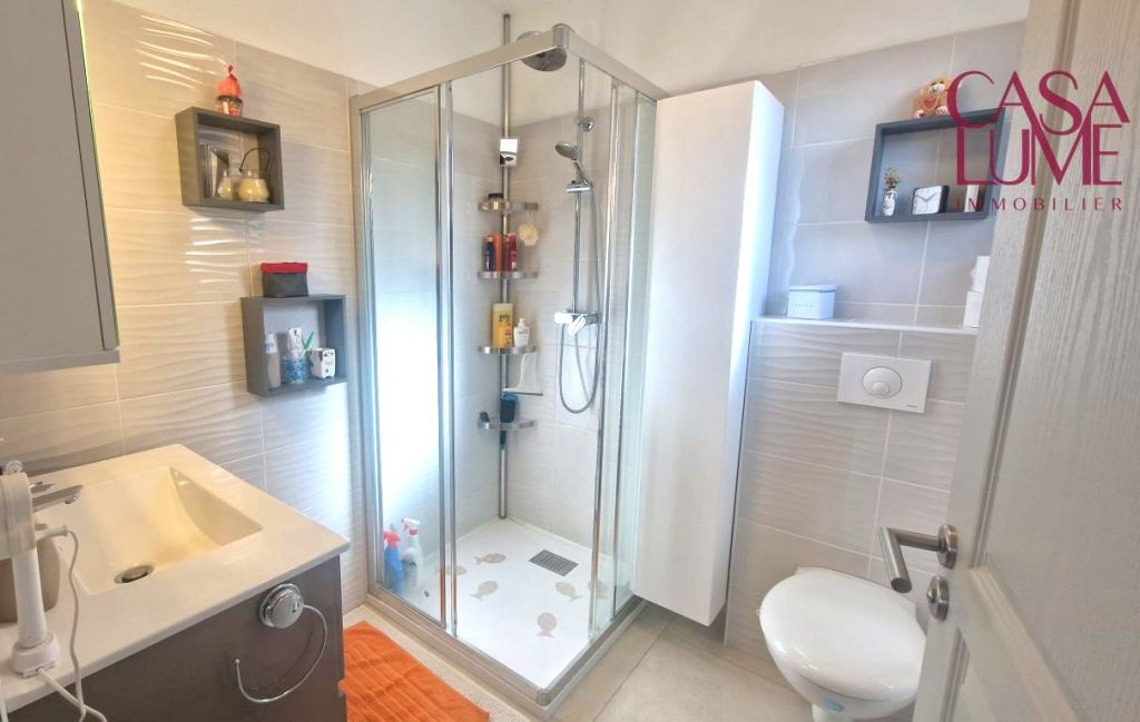 Le F3 d’une surface de 50 m² habitable est en rez de chaussée, il est indépendant, il possède lui aussi un espace terrasse couvert avec une pergola bioclimatique en aluminium. Un grand garage de 40 m² et un espace atelier + cave de 25 m² complète la maison.